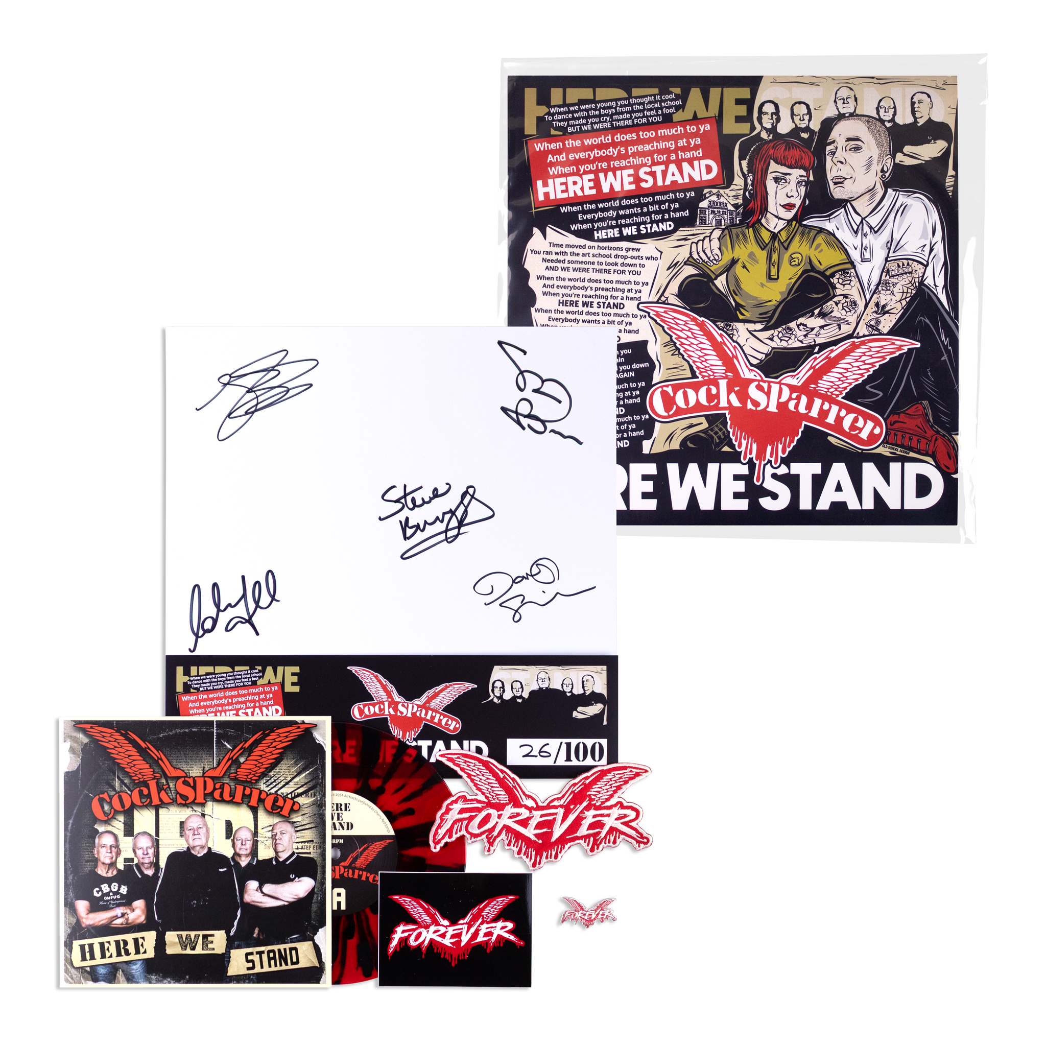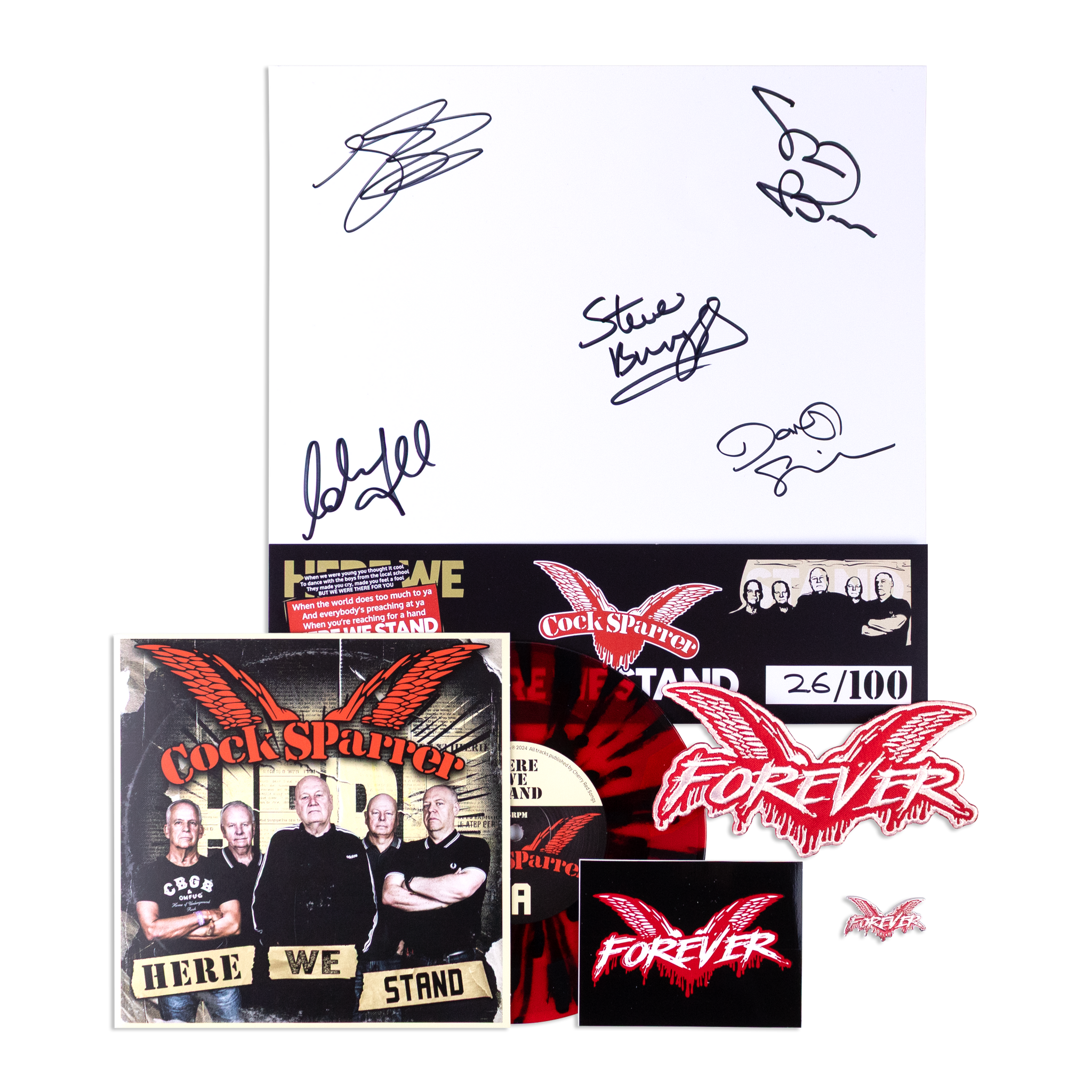 Autographed Cock Sparrer Here We Stand Vinyl 7”, special pressing on Red and Black marbled vinyl. Bundle incudes special limited edition art work / lyric sheet created by ‘Old School Design’, Also included, enamel pin, embroidered patch, & sticker (Forever Design, or Cock Sparrer traditional logo). Limited to quantity of 50, however there are currently less than 12 available for purchase.